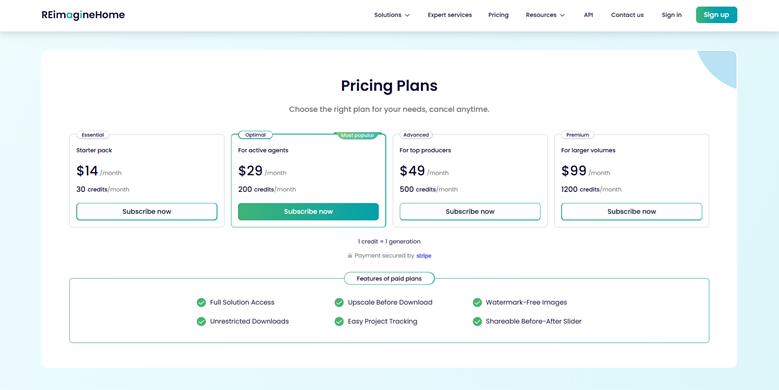 • Cost: 5 free designs; credit packages start at $14/month for 30 credits.